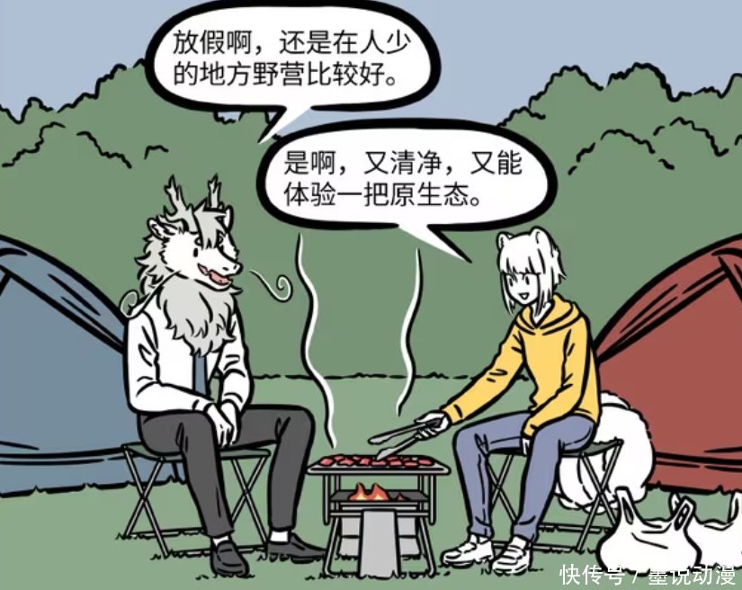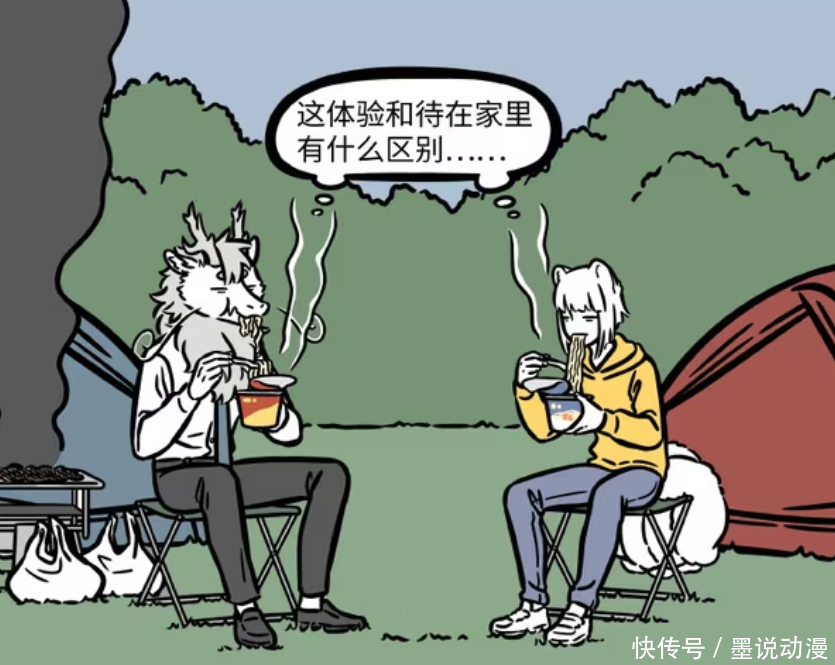 《非东谈主哉》漫画版中,九月和敖烈不息去游玩,这一次安排去野营,照旧两个东谈主一皆。原来九月和敖烈还挺享受野营的乐趣,然而敖烈为了加速食材烤熟,放了一把火。最终食材全毁,只剩下泡面能吃。另外深夜时候,九月睡不着,径直化身九尾狐,在原野合手老鼠。