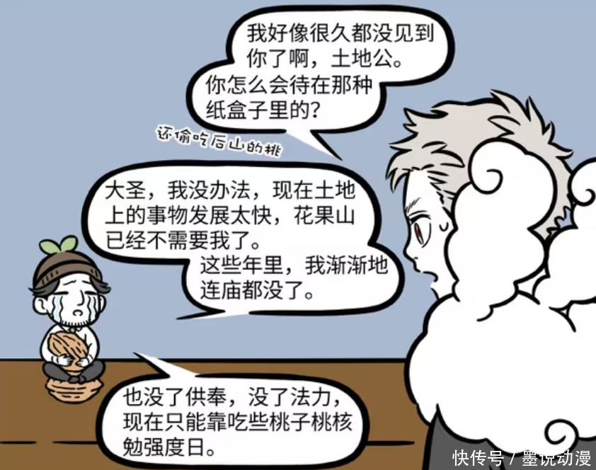 孙悟空暗示很久莫得见到地皮公,还问他为何要待在纸盒里。地皮公亦然无奈,当今地皮上的事物发展的太快,花果山齐不需要隘皮公了。这些年来,地皮公连庙齐逐渐没了。莫得供奉,也就莫得法力,地皮公只可靠着吃桃子和桃查对付过活。