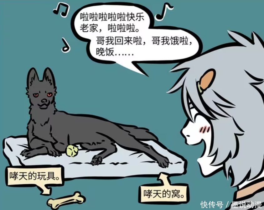 《非东谈主哉》漫画版中,哮天伴随在杨戬身边数千年,从他很小的技术就奴隶在身边。正本哮天以为他是杨戬的最爱的狗,没思到杨戬另有新欢。祸斗更是鹊巢鸠据,哮天的舒坦旧地没了。在知谈我方输在那儿之后,哮天只可借酒浇愁。