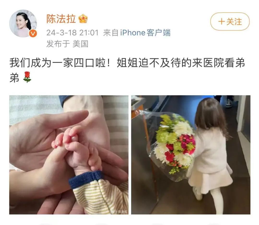 2019年5月,陈法拉和法国男友成婚,2020年底女儿”小米妮“出身。近日,陈法拉在外交平台晓喻二胎得子。