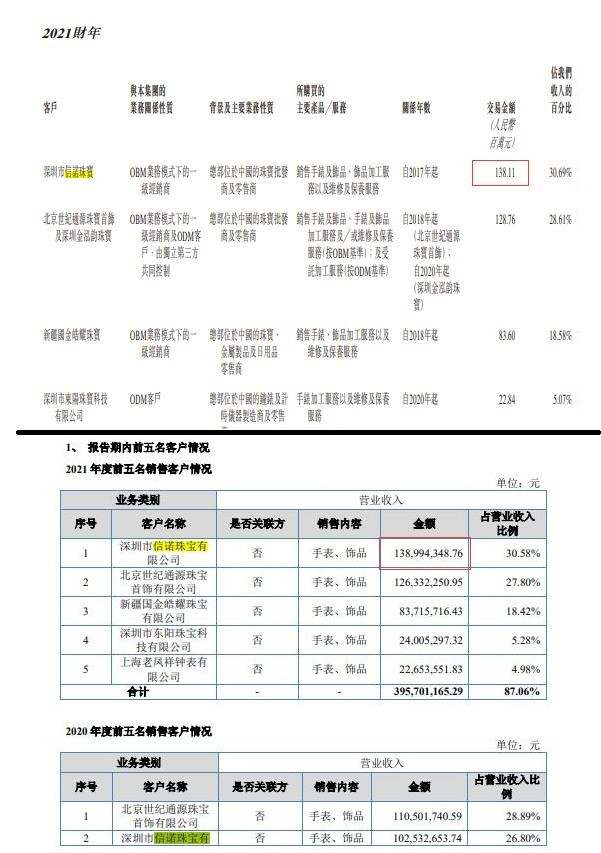 2022年的客户数据也存在相通的情况。举例西普尼在新三板裸露的2022年年报裸露,其该年度第一大客户也曾是深圳市信诺珠宝有限公司,对应销售额是11681万元,而IPO肯求文献则裸露为11587万元,出入也独特十万元,其余四大客户数据也存在部分相反。