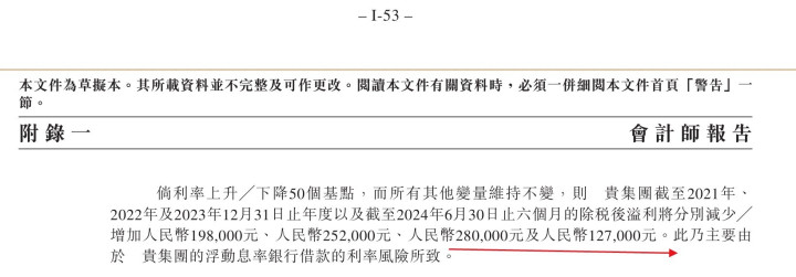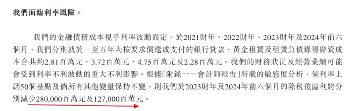 西普尼在IPO肯求文献中的“咱们濒临利率风险”部分提到:“字据‘附录一-管帐师论述’所载的敏锐度分析,倘利率上调50个基点及倘悉数其他变量保捏不变,则咱们于2023财年及2024年前六个月的除税后溢利将分袂减少280,000百万元及127,000百万元。”据此衔接,其利润影响是达到2800亿元和1270亿元。