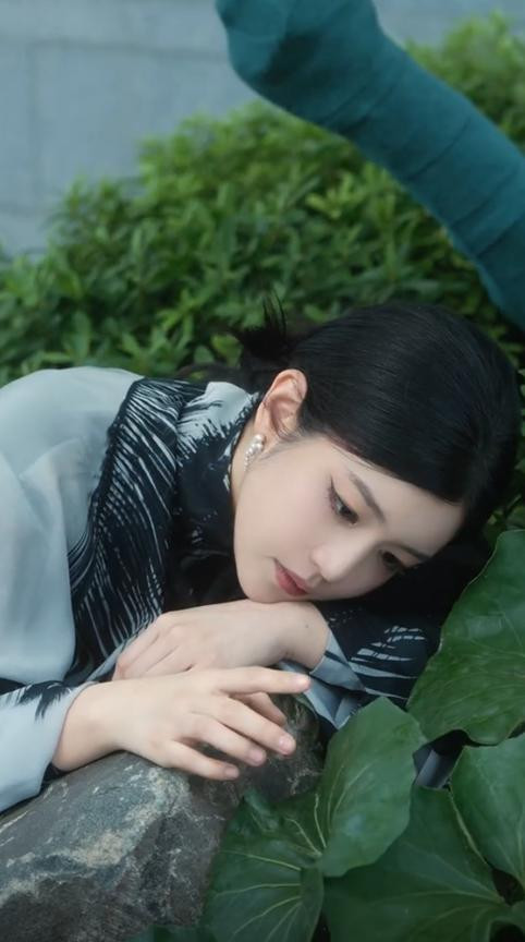 画面一溜,她趴在了一块大石头上,用左手摆弄着隔邻的植物。