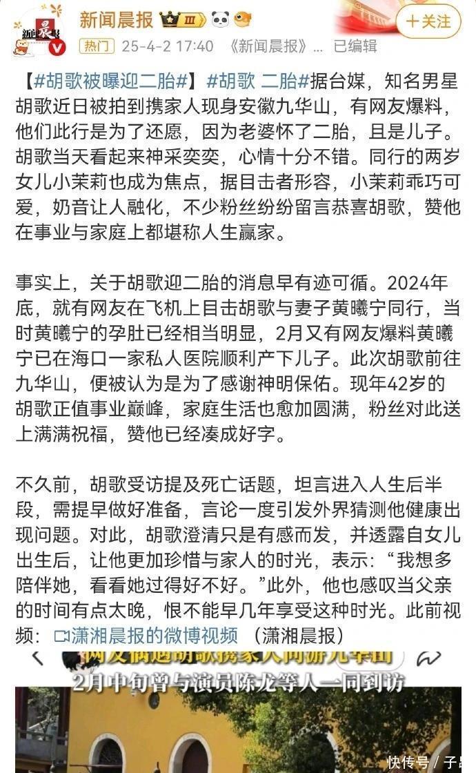 本年4月,媒体拍到胡歌带家东说念主去九华山还愿,妻子黄曦宁体态悦耳,那时就有二胎揣摸。