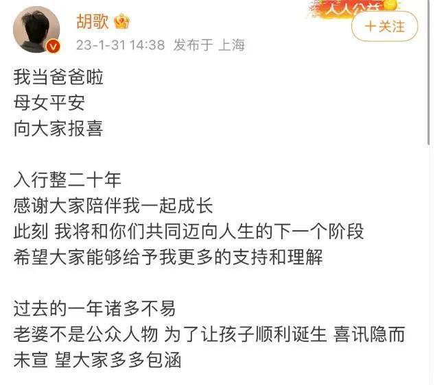 2023年1月底,胡歌俄顷发文:“我当爸爸了,母女吉利”,让统统东说念主惊掉下巴。