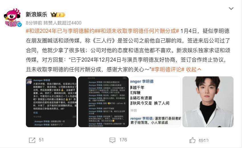 随后,和颂传媒发表声明,阐明已于2024年12月24日与李明德友好协商并坚硬了相助断绝合同,且未收取其任何片酬分红。