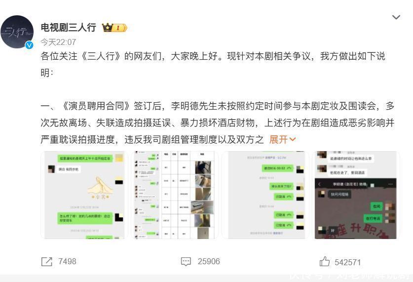 跟着事件的发酵,《三东说念主行》剧组也发表了声明,对与李明德的关连争议进行了回报。