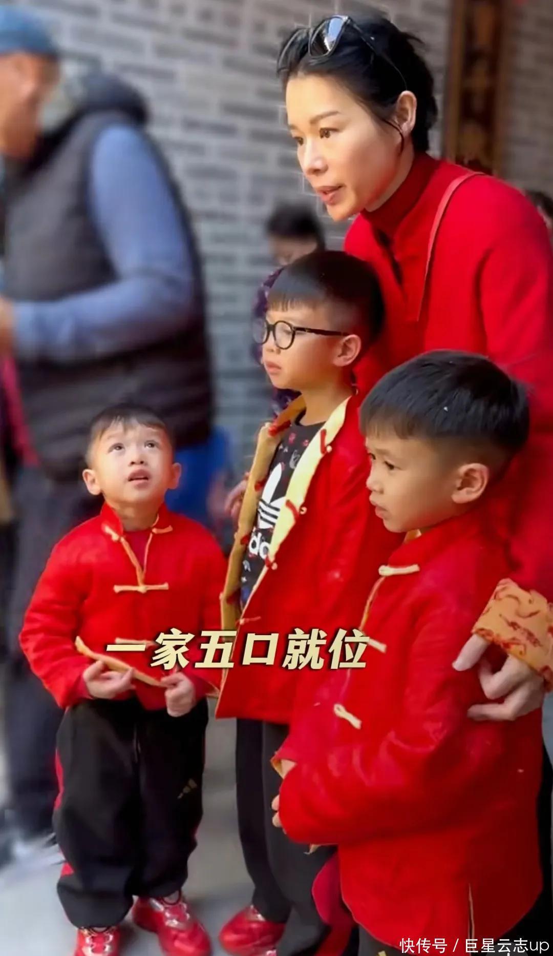 胡杏儿和三个男儿齐穿戴大红色的唐装,李乘德穿戴玄色唐装,一家东谈主的穿衣打扮喜气洋洋,充满了节日喜庆的滋味!