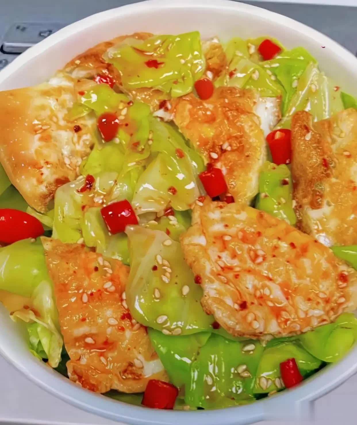 包菜小半个、鸡蛋2个、大蒜3瓣、小米椒1个、生抽1.2勺、香醋半勺、盐小数、香油3滴