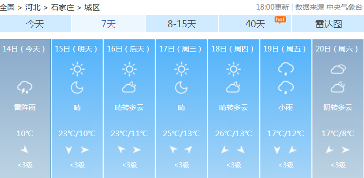 17日起至20日,还会有冷空气影响我国,降温力度更大,彰着的降温还会涉及黄淮等地。大城市中,像石家庄19日最高气温将跌至17℃。